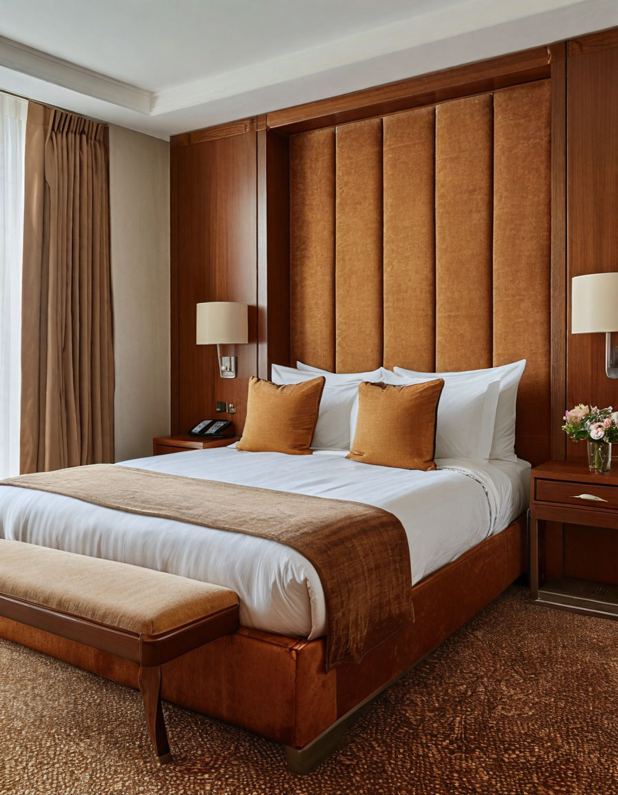 Мебель для номеров: кровати различных типов (двуспальные, односпальные, кровати king-size), прикроватные тумбочки и столики, шкафы и гардеробы для хранения одежды, письменные столы и стулья